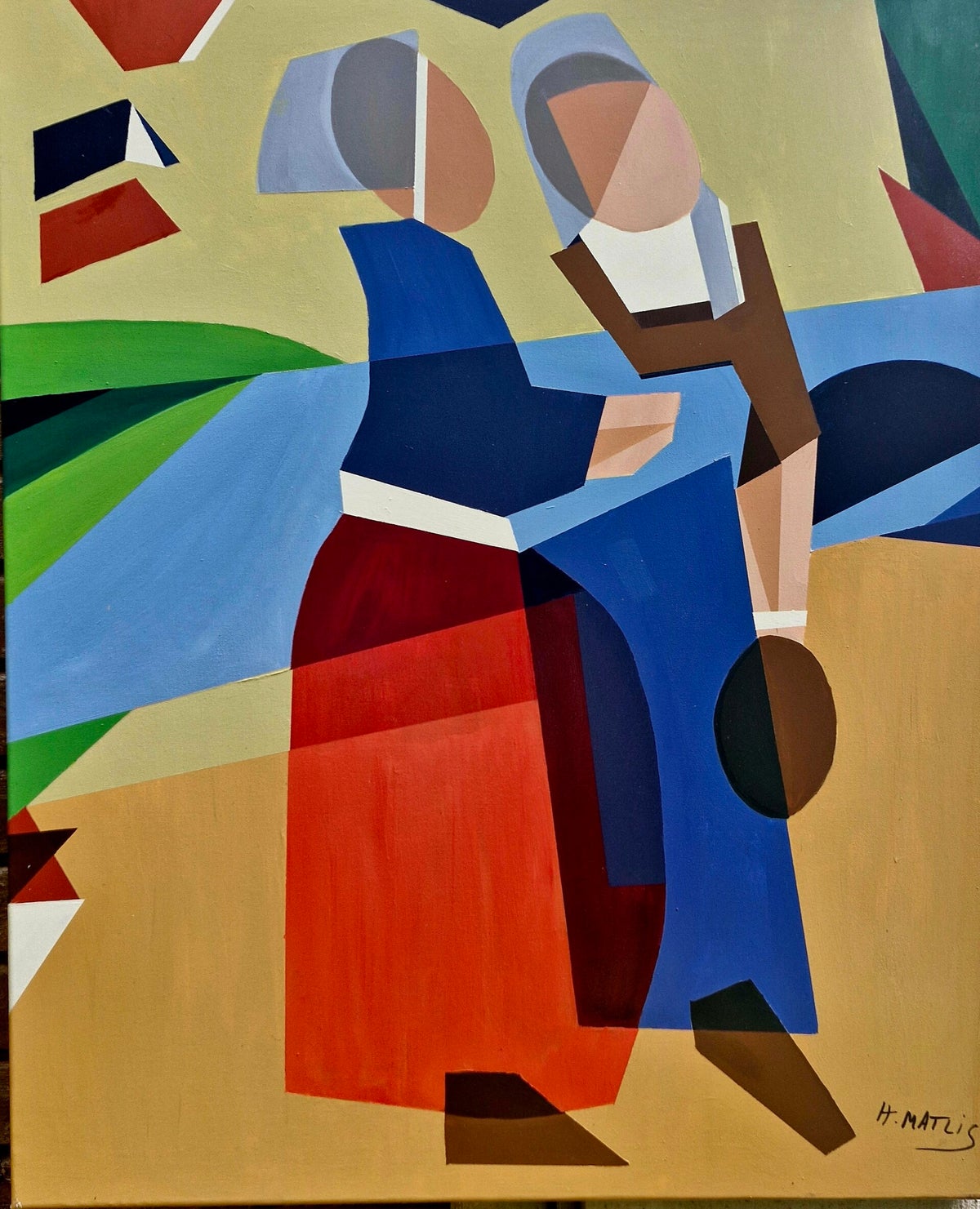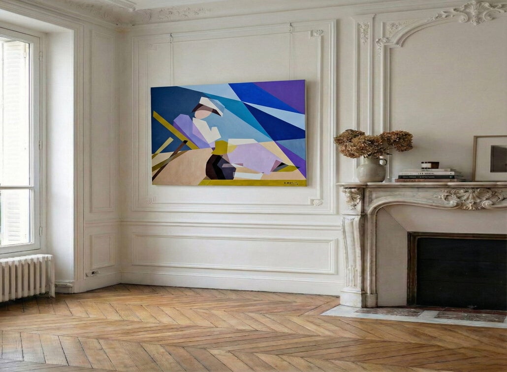 J'utilise des peintures acryliques extra fines pour créer des aplats de couleurs vives, des formes géométriques et une maîtrise de la lumière. Elles racontent des récits à la fois contemporains et intemporels : l'enfance, condition féminine, luttes intérieures, moments de poésie… quelquefois des collages de polycarbonate pour des effets saisissants.